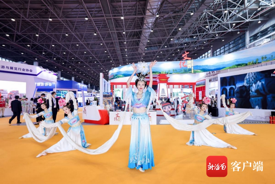 中外休閑旅游展區內,由陜西省歌舞劇院演員們帶來的唐宮舞,吸引了不少觀眾駐足。在“陜西館”,葡萄花鳥紋香囊、飛廉紋飾的絲巾、四鸞銜狩紋化妝鏡……一件件制作精美的文創產品無不展示著這座古都的文化和歷史沉淀?!百F州館”內,身著面族傳統服飾的工作人員向觀展群眾介紹貴州民族特色習俗。