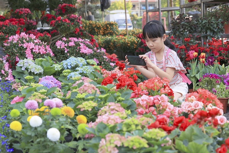 1月25日,一名小朋友在花叢中用手機(jī)記錄五顏六色的鮮花。三亞日報記者 陳聰聰 攝