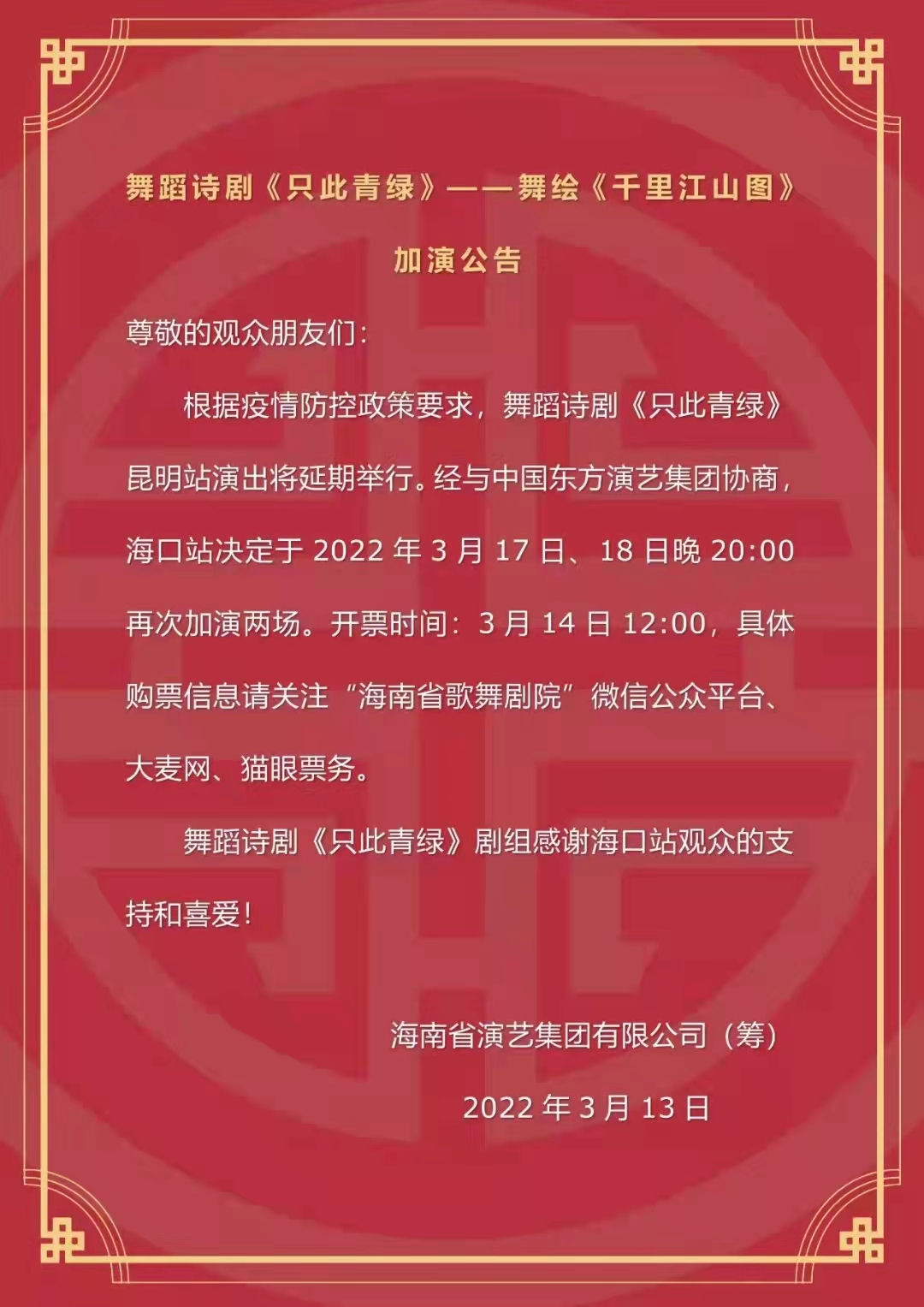 據了解,自《只此青綠》在海口拉開二輪全國巡演大幕以來,觀眾觀劇熱度一直不減。《只此青綠》海口站是截至目前為止,巡演城市中加場最多的一站。該劇在海口經歷了開票、搶光,加場、搶光……但依舊場場爆滿、一票難求。鑒于觀眾的喜愛,加上受疫情防控政策要求影響,舞蹈詩劇《只此青綠》昆明站演出將延期舉行,海南省演藝集團有限公司(籌)與中國東方演藝集團協商,舞蹈詩劇《只此青綠》將在海口加演,演出時間為3月17日、18日20時。開票時間為3月14日12:00。