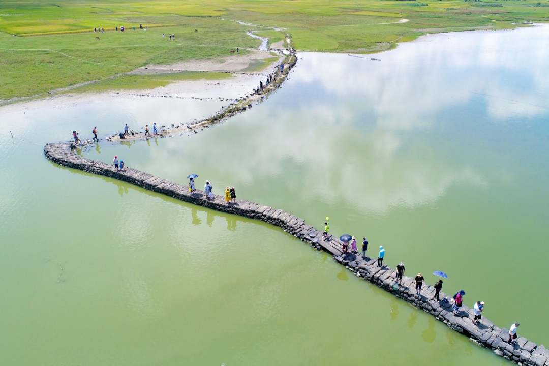 站在“美味山”上,招風樹下有不少乘涼的游客,居高臨下觀看“蛇橋”,有如一條大黑蛇臥于大河中,蜿蜒過河,蛇橋另一端漸漸隱沒于天邊的綠色田野之中。長長的火山巖壘成的黑橋浮于水面,顯得格外分明,奪人眼球。