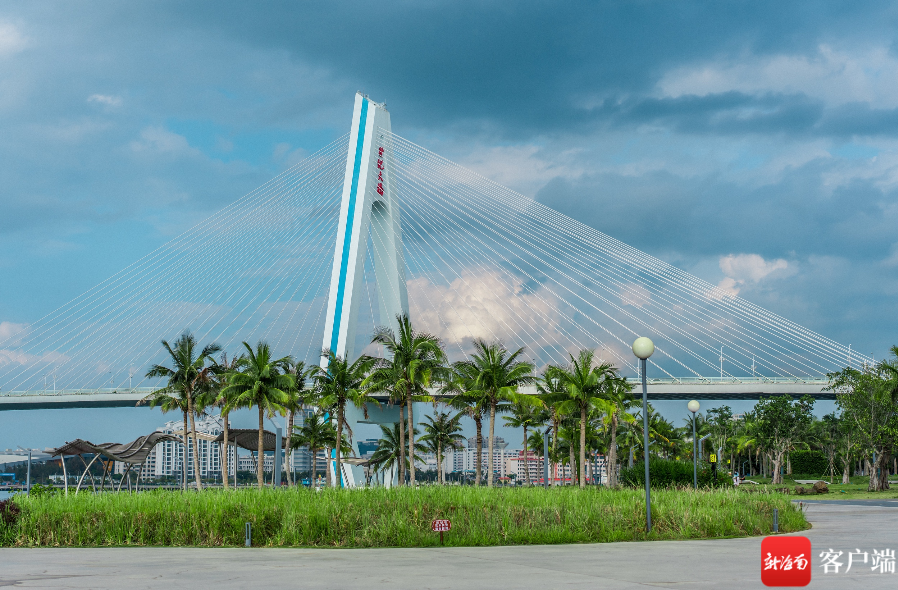 初春的海口灣, 椰樹與世紀(jì)大橋相互映襯,別有一番椰城韻味。