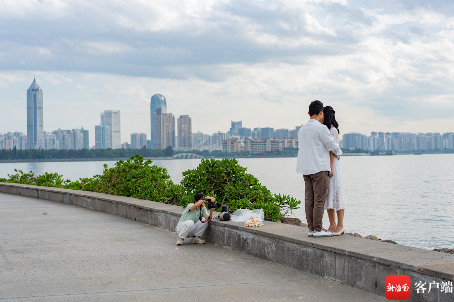 海口灣公園一角,攝影師為一對(duì)剛領(lǐng)結(jié)婚證的新婚夫婦拍照留念。