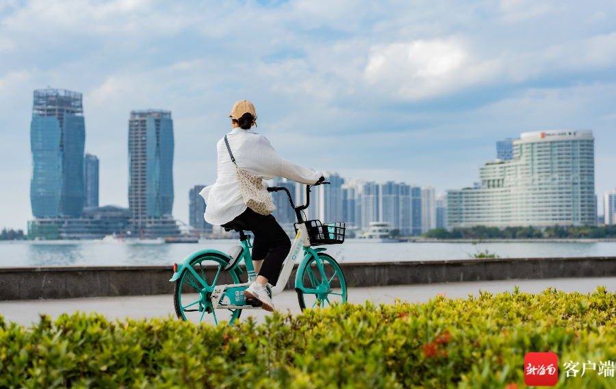 海口灣公園騎行的女孩,眺望著對(duì)岸建設(shè)中的新廣場。