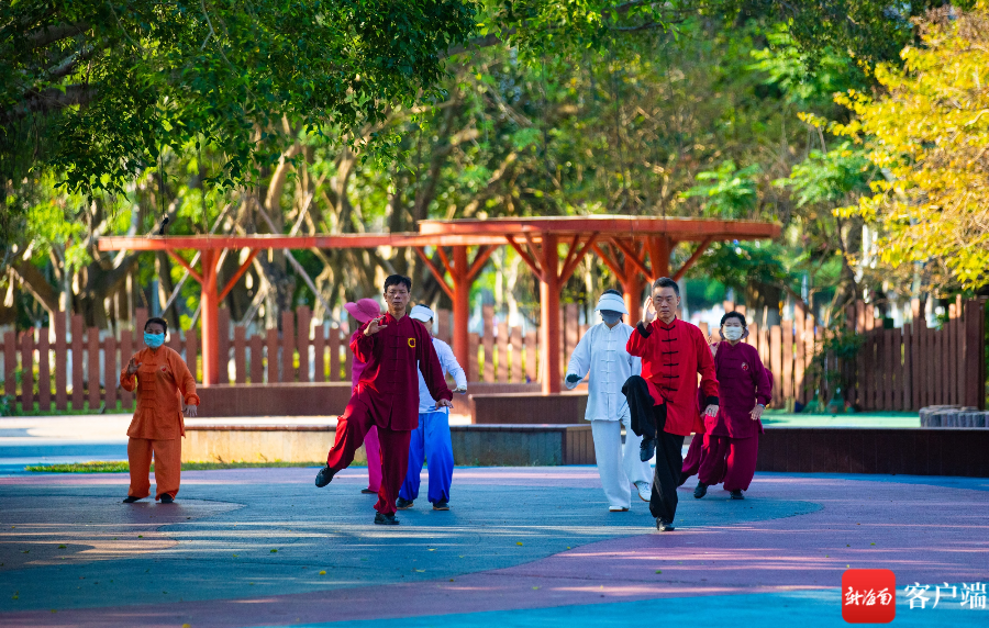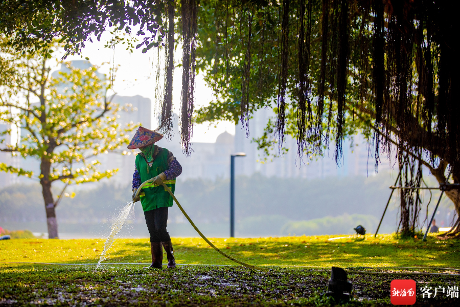 海口灣一角,一群好友在樹蔭下聚會(huì)聊天。