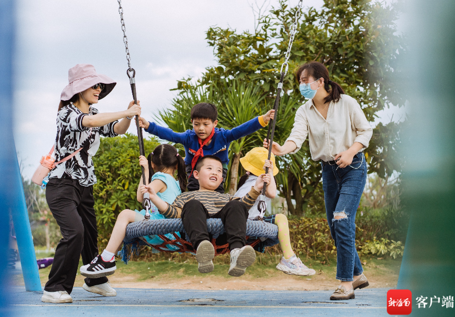 海口灣兒童活動(dòng)區(qū),小朋友們?cè)诩议L的陪護(hù)下玩耍著。