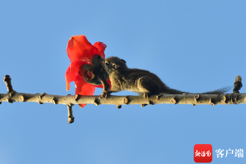 一棵木棉樹上,兩只小松鼠同框。記者 陳衛東攝