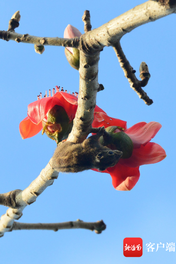 小松鼠在木棉樹上享用大餐。記者 陳衛東攝