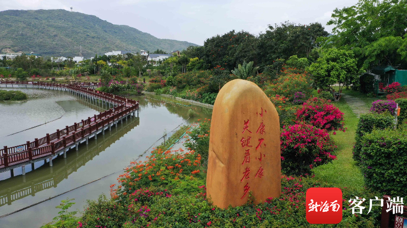 4月20日,三亞市吉陽(yáng)區(qū)博后村,鐫刻著“小康不小康,關(guān)鍵看老鄉(xiāng)”的石碑立在棧道環(huán)繞的哎岬湖畔。記者 沙曉峰 攝