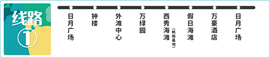 經停站點:日月廣場、鐘樓、外灘中心、萬綠園、西秀海灘(帆船基地)、假日海灘、萬豪酒店、日月廣場