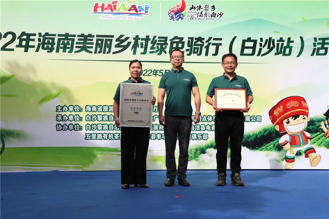 縣政府副縣長劉磊出席并為五里路有機茶園頒發“海南省四椰級鄉村旅游點”及“海南省旅游協會騎行旅游分會合作協業”牌匾。