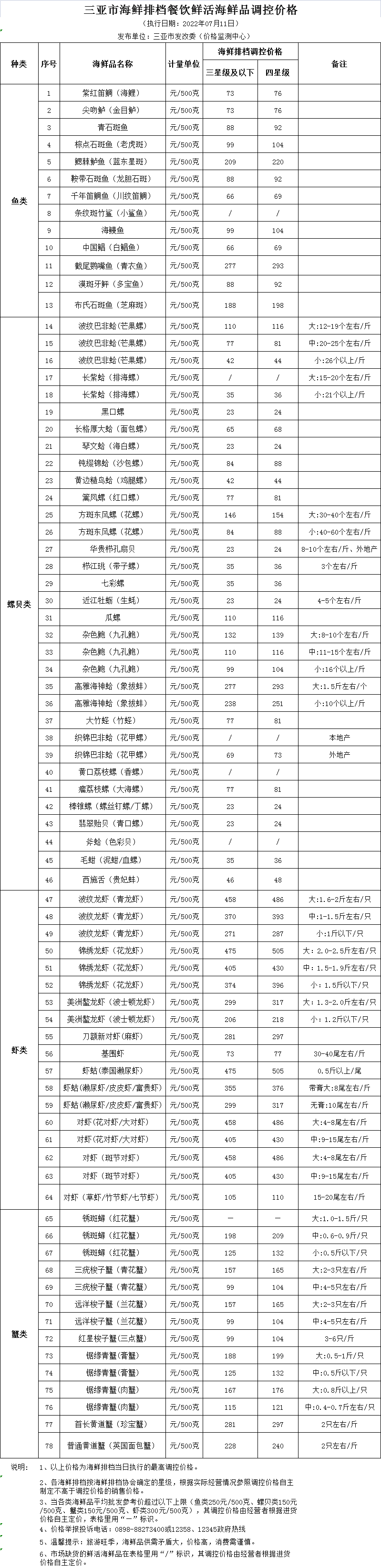 三亞市海鮮排檔餐飲鮮活海鮮品調控價格(2022.07.11)