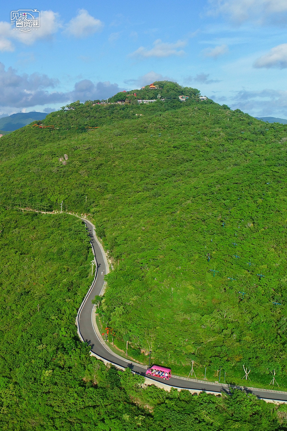 7月12日,俯瞰三亞市鹿回頭景區,一輛觀光車輛載著游客在景區公路上穿梭,欣賞周邊風景。見習記者 王程龍 攝