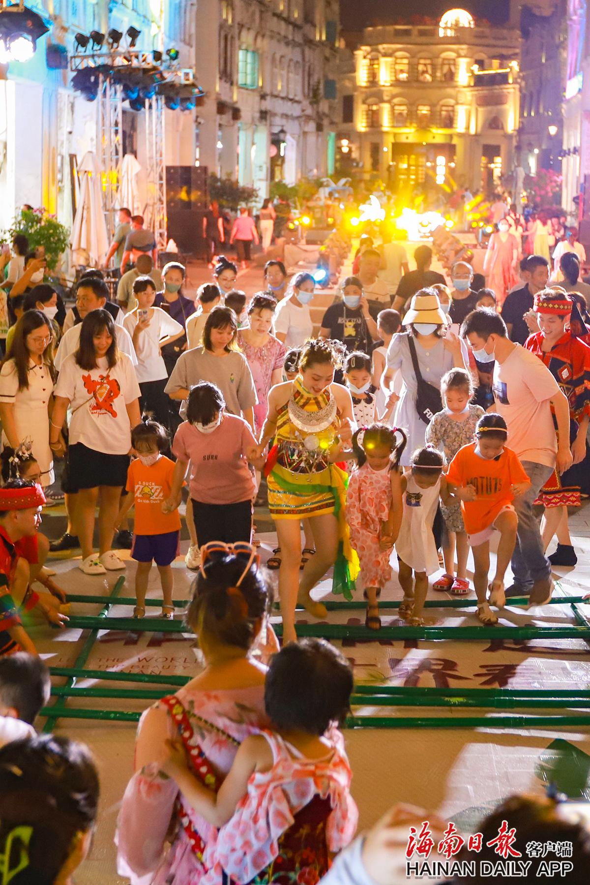 7月26日,“非”凡消博“遺”世獨(dú)立 讓世界看見海南美非遺特色展在海口龍華區(qū)騎樓老街舉行,表演者帶領(lǐng)小朋友跳起竹竿舞。海南日?qǐng)?bào)見習(xí)記者 王程龍 攝