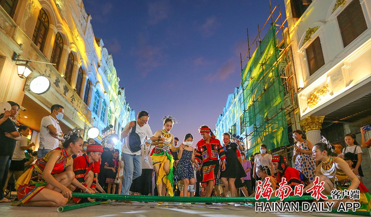 7月26日,“非”凡消博“遺”世獨(dú)立 讓世界看見海南美非遺特色展在海口龍華區(qū)騎樓老街舉行,市民游客與表演者一同跳起竹竿舞。海南日?qǐng)?bào)見習(xí)記者 王程龍 攝