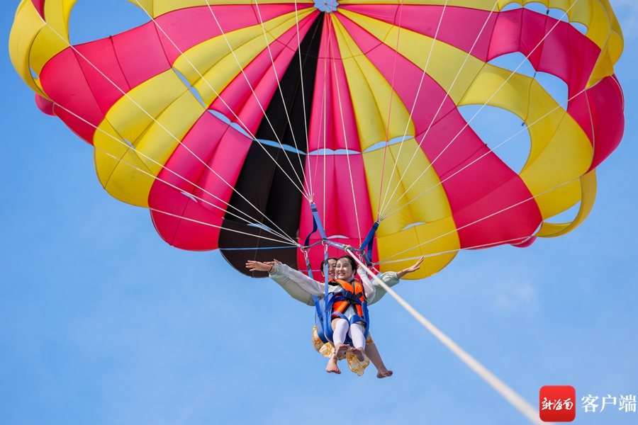 資料圖:游客在三亞蜈支洲島旅游區體驗彩虹拖傘。武昊 攝