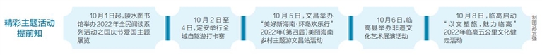 10月5日,省旅文廳將在文昌舉辦“美好新海南·環(huán)島歡樂(lè)行”2022年(第四屆)美麗海南鄉(xiāng)村主題游文昌站活動(dòng),以鄉(xiāng)村旅游消費(fèi)和鄉(xiāng)村旅游推介為側(cè)重點(diǎn),組織鄉(xiāng)土、鄉(xiāng)創(chuàng)、美食、非遺等市集,融合民族文化活動(dòng)、鄉(xiāng)村沉浸式體驗(yàn)和打卡鄉(xiāng)村旅游精品線路等新形式,促進(jìn)鄉(xiāng)村旅游發(fā)展。