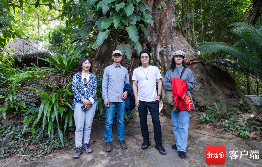 “走進黎族”文化名家采風團在呀諾達熱帶雨林文化旅游區(qū)合影。從左依次為:馮晏、黃梵、胡竹峰、林雪。記者 李昊 攝