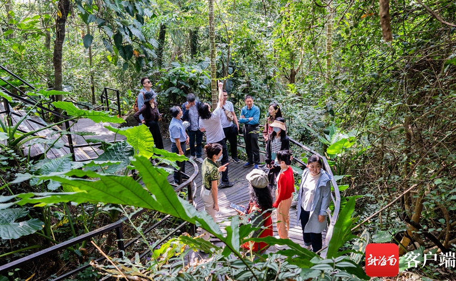 10月30日,“走進黎族”文化名家采風團走進位于保亭的呀諾達熱帶雨林文化旅游區(qū),在黎家阿妹的帶領下,近距離觀察雨林生靈,與自然對話。記者 李昊 攝