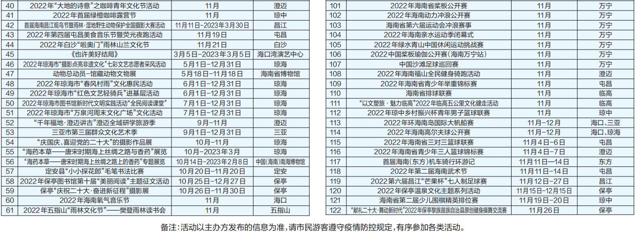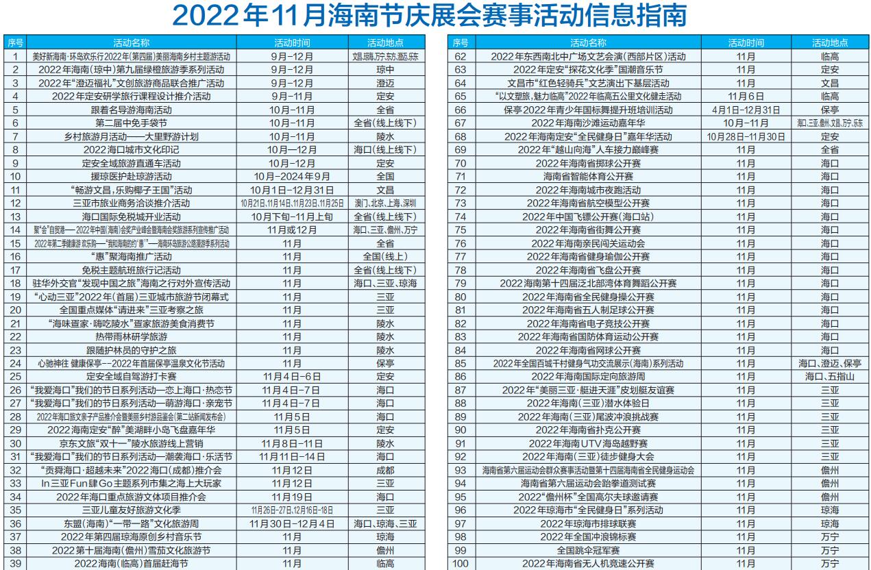 疫散云開,重見海南。為持續(xù)激發(fā)文化、旅游和體育消費(fèi)活力,海南11月將推出百余場(chǎng)旅文體活動(dòng)(具體活動(dòng)詳情可關(guān)注“陽光海南網(wǎng)”公眾號(hào)和下載“智游海南”APP)。