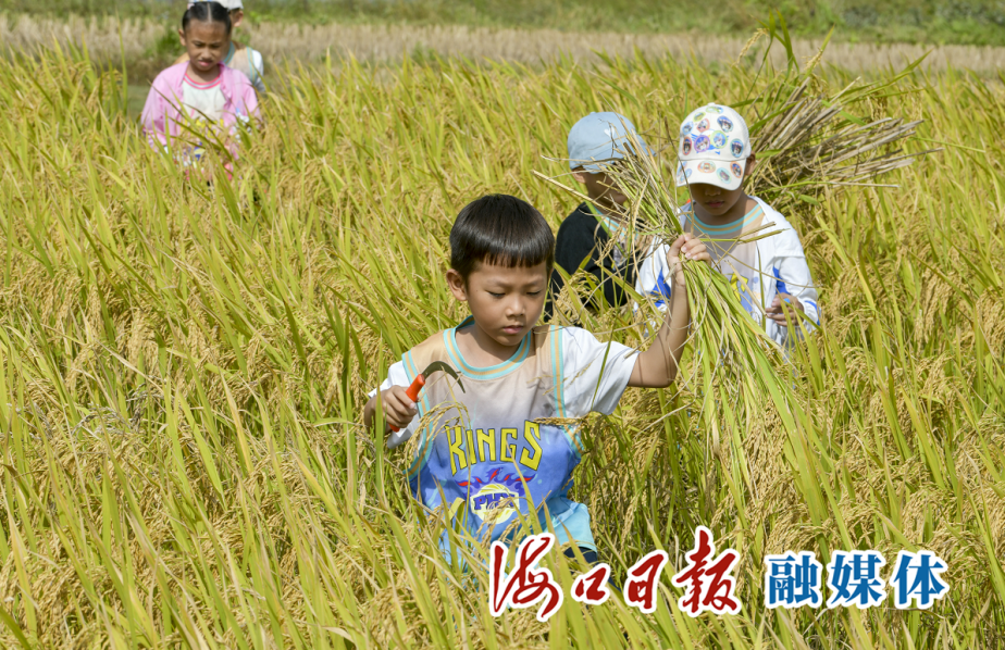 龍華區龍泉鎮美仁坡村委會,小朋友在田間割稻,體驗農耕文化。??谌請笕诿襟w記者 康登淋 攝