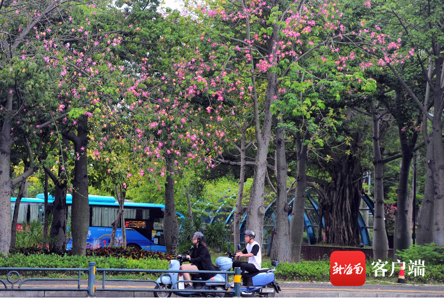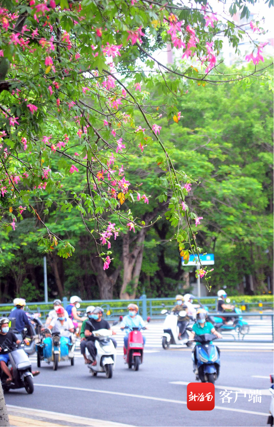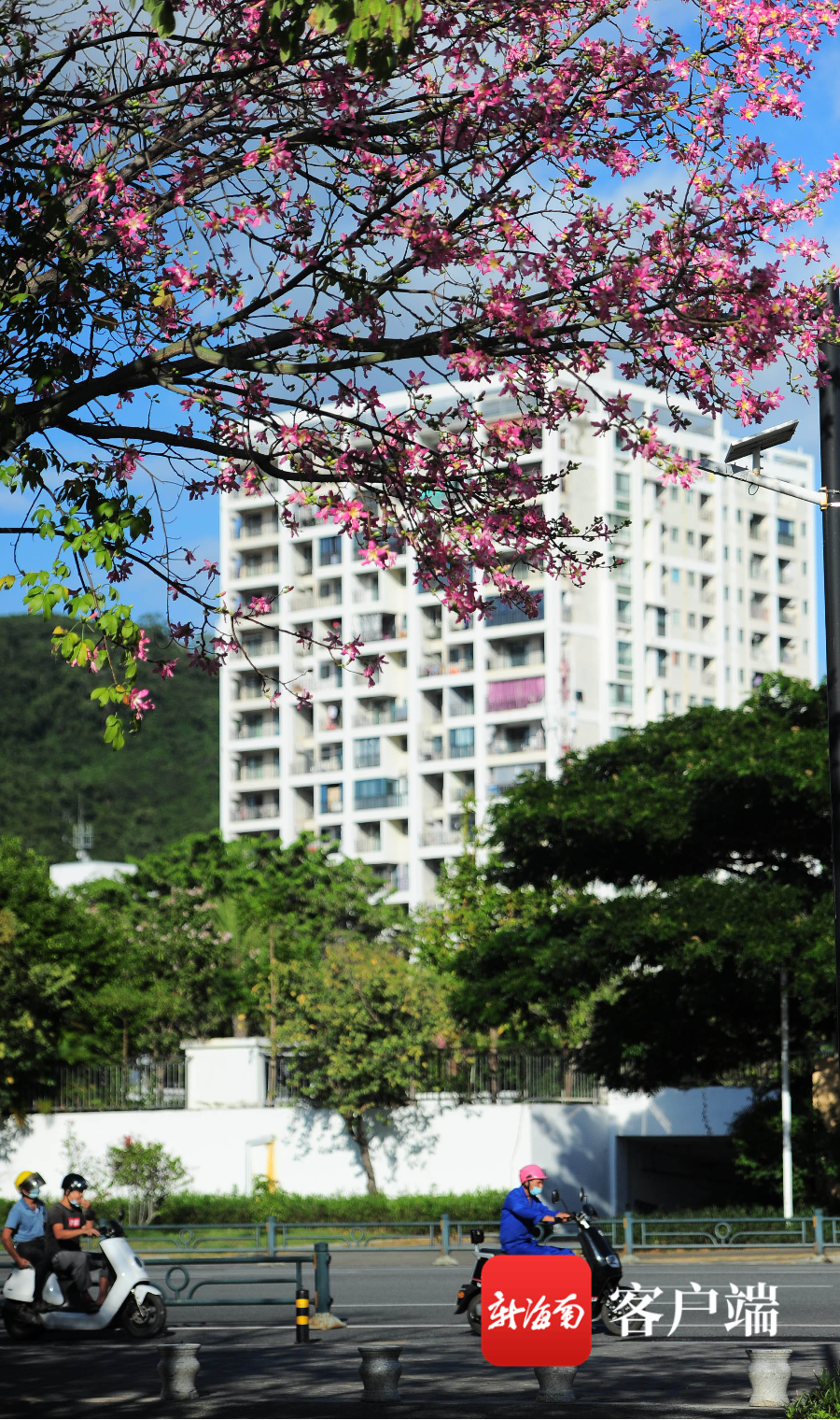 11月15日,三亞,騎行的路人從盛開的異木棉花下經(jīng)過。記者 沙曉峰攝