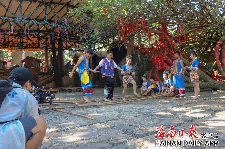 蕭聲悠悠、非遺傳情。在景區(qū)的三月三廣場,黃志偉用黎族獨有的竹木樂器——鼻蕭,吹起動聽的黎家小調,開啟了神奇美妙的非遺之旅。“手板這么一打呀,車把高速下,眼前的檳榔谷風景美如畫……”講解過程中,黃志偉這段動感時尚的“rap”為觀眾帶來耳目一新的感覺,加深了人們對檳榔谷的向往。