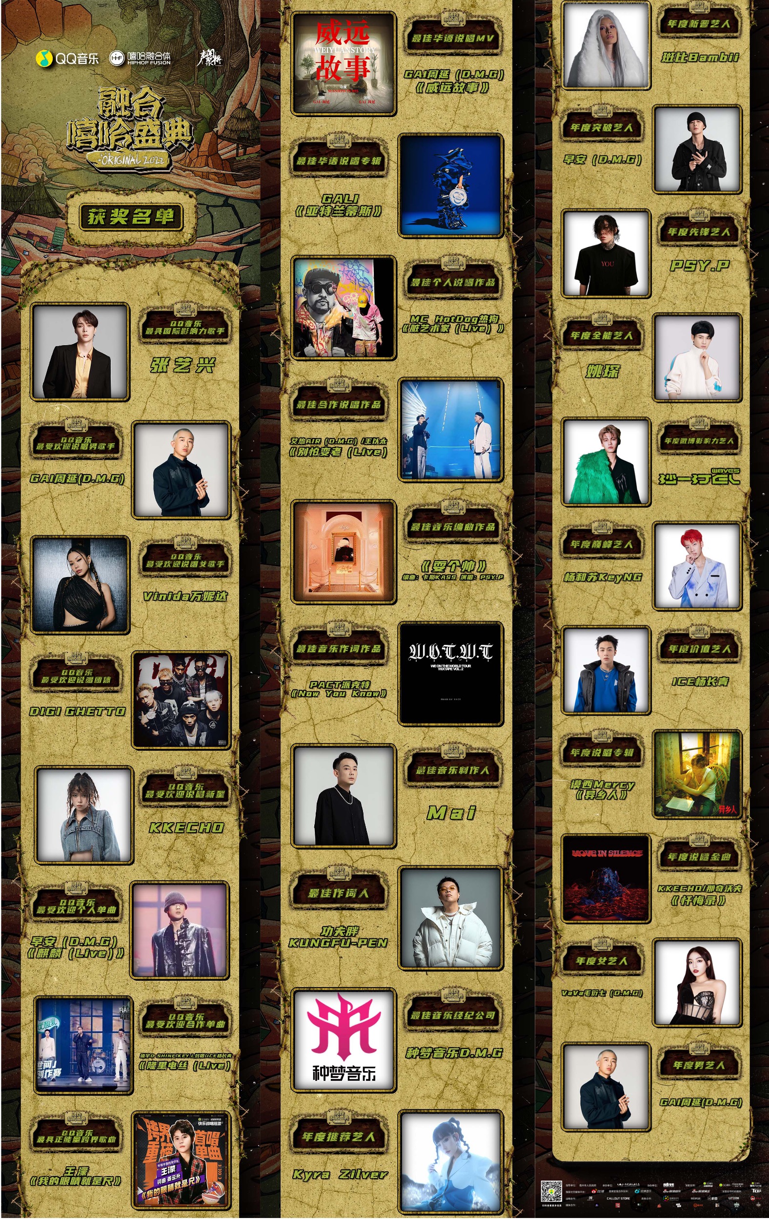 本屆盛典集結眾多說唱大咖與跨界歌手,合力為說唱愛好者們貢獻了一場“名場面”不斷的“哈圈年會“。2022QQ音樂融合嘻哈盛典作為專注服務于說唱文化的權威頒獎典禮,全場頒出累計30個重磅獎項。 2022QQ音樂融合嘻哈盛典既是對過去一年華語說唱的總結,亦是對未來的期許與展望。