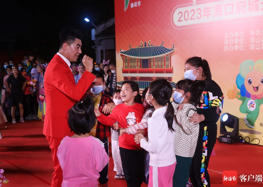 廣場(chǎng)換花舞表演間隙,主持人與孩子們熱鬧互動(dòng)。記者 姚皓 攝