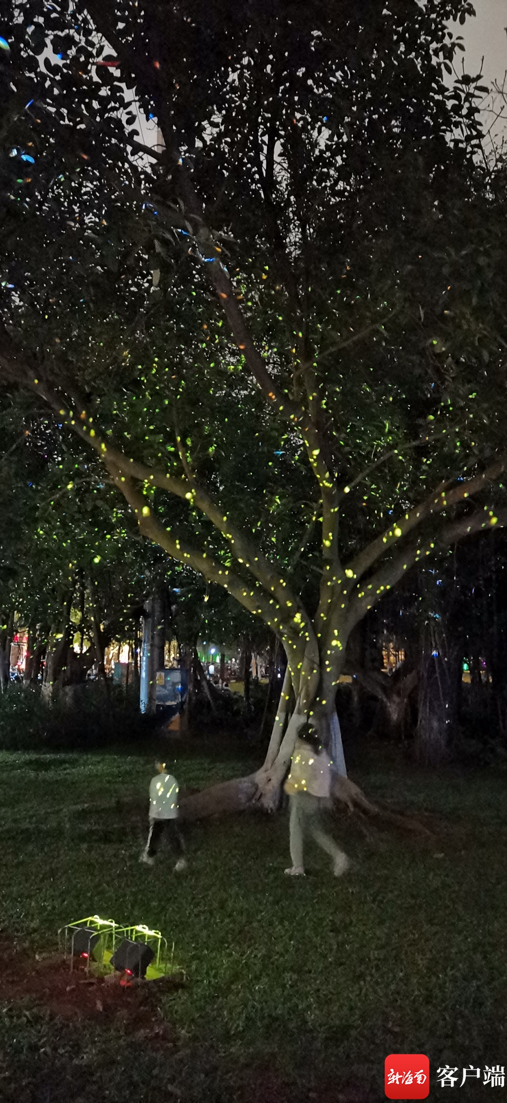 當晚將近八點,跟隨人潮,記者從萬綠園南門入口入園,沒走幾步路就發現,一些樹木旁安裝了特色的螢火蟲燈光,從地面燈具射出的或綠或黃的黃被分散為許許多多的星點投射到樹木的枝葉上,而且隨著燈具的轉動在樹身上顯出光影斑駁的美象?!皨寢?,這些燈光好漂亮啊,就像螢火蟲一樣一閃一閃的!”現場,一些小朋友被吸引住,圍著樹木跑動。