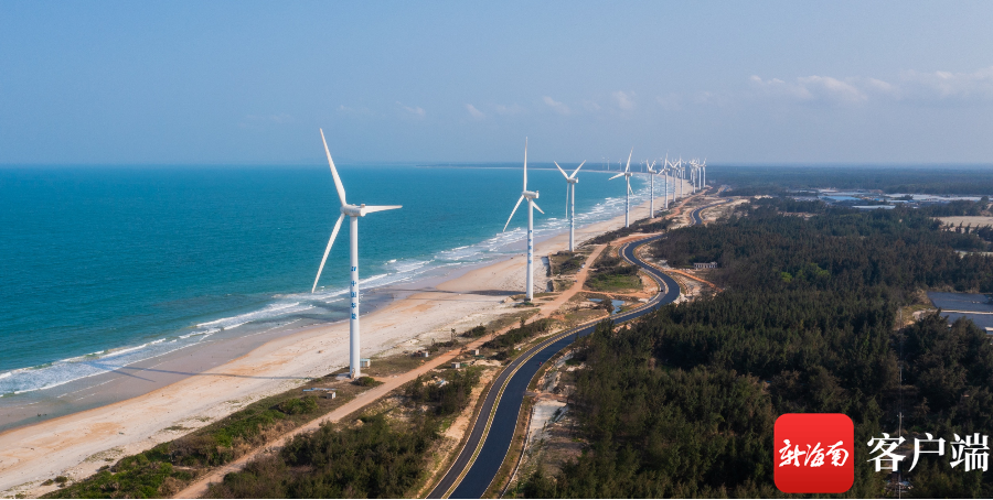 在文昌木蘭灣沿海,連排的風力發電機形成一道獨特的風景,一側的環島旅游公路也已初現形態。記者 李昊 攝