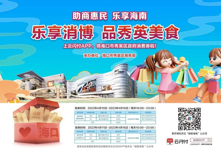 不同類型消費券的發(fā)放時間如下:國際免稅城餐飲消費券發(fā)券時間:2023年4月10日-2023年4月16日(每天10:00—23:00);遠大購物中心餐飲消費券發(fā)券時間:2023年4月11日-2023年4月16日(每天10:00—23:00);星茂購物中心餐飲消費券發(fā)券時間:2023年4月11日-2023年4月16日(每天10:00—23:00)。