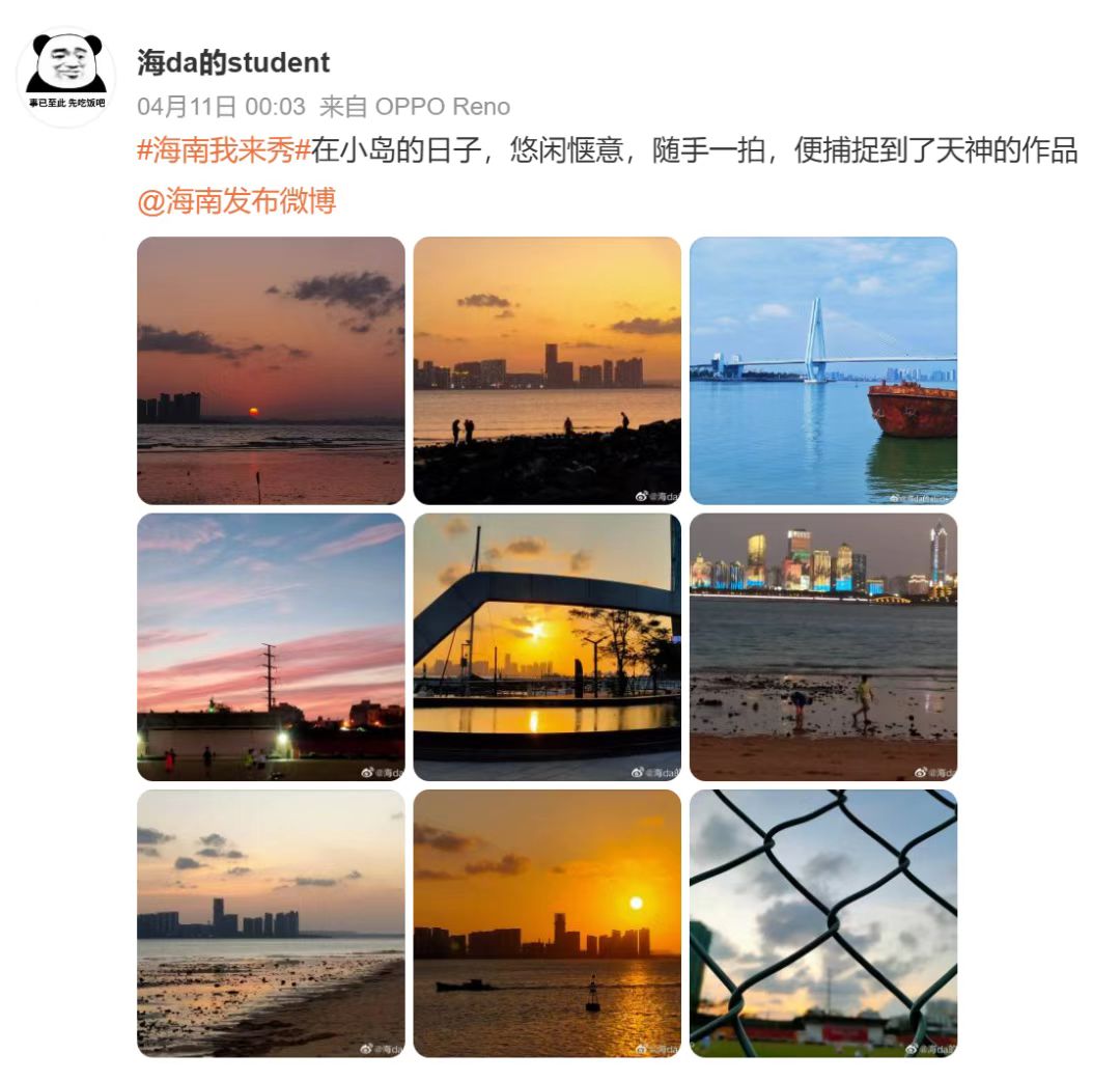 新海南客戶端、南海網(wǎng)、南國都市報(bào)4月17日消息(記者 王燕珍)一張張美圖顏值爆表,讓人直呼“絕美”,堪稱海南美景“名場面”集合,自4月10日海南發(fā)布聯(lián)合海南省融媒體中心、各市縣融媒、各廳局政務(wù)號(hào)、海南省新媒體協(xié)會(huì)、??谑行旅襟w協(xié)會(huì)共同推出“海南我來秀”活動(dòng)第一期主題“秀海南名片”以來,吸引了海南社會(huì)各界、各地網(wǎng)友參與。不僅海南大部分市縣融媒紛紛投稿,就連海南省新媒體協(xié)會(huì)、海口市新媒體協(xié)會(huì),自媒體達(dá)人也踴躍參加,大家紛紛曬出各地的美景美食等,儼然成為所在地區(qū)的“代言人”?;顒?dòng)上線后,截至4月17日22時(shí)左右,就有1300多人次參與討論,僅微博話題閱讀量就有217萬+。