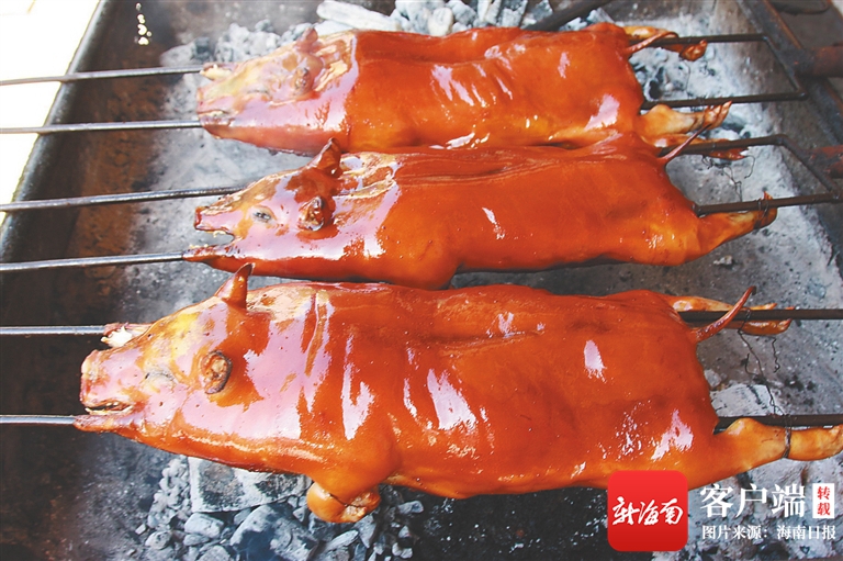 在海南西部的臨高和東方,烤乳豬是一道地方特色菜,不少游客專程前往當(dāng)?shù)氐牟蛷d吃烤乳豬。餐廳工作人員提前將洗凈的整只乳豬腌制好,然后抹上油,放在炭火上烤。在烤制的過(guò)程中,可以看到豬皮逐漸變成金黃色,肉中的油脂被烤出來(lái),滴落在炭火上,發(fā)出滋滋聲。為保證受熱均勻,一般會(huì)有專人在烤爐邊上給乳豬翻面。等到肉皮由軟變脆,空氣中彌漫著肉香,一只烤乳豬便可以下架、切塊上桌了。